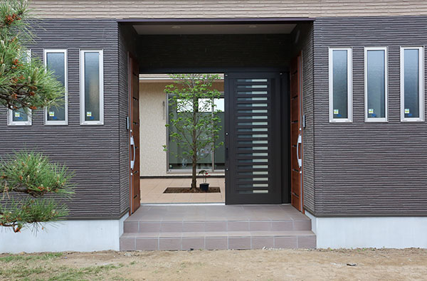 外観は、周囲からの砂埃による外壁の汚れが想定されるため、なるべく汚れの落ちやすい外壁材を採用しました。色味についても、Nさまのご希望もありどっしりと落ち着いた印象を醸すものにしました。