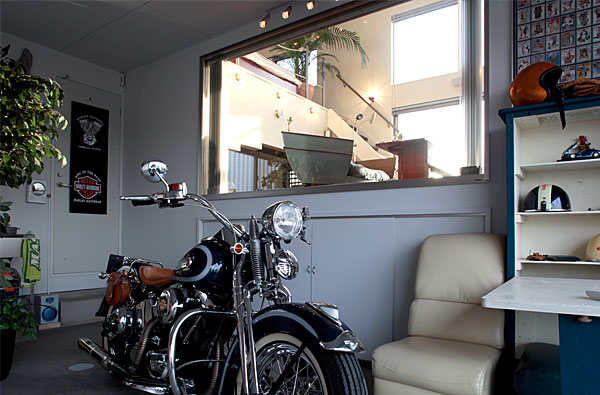 青色の「子世帯」は、リビングからガレージの愛車を眺められる構成とし、インテリアも船の内装のようにして、大人の遊び心をくすぐる空間に。